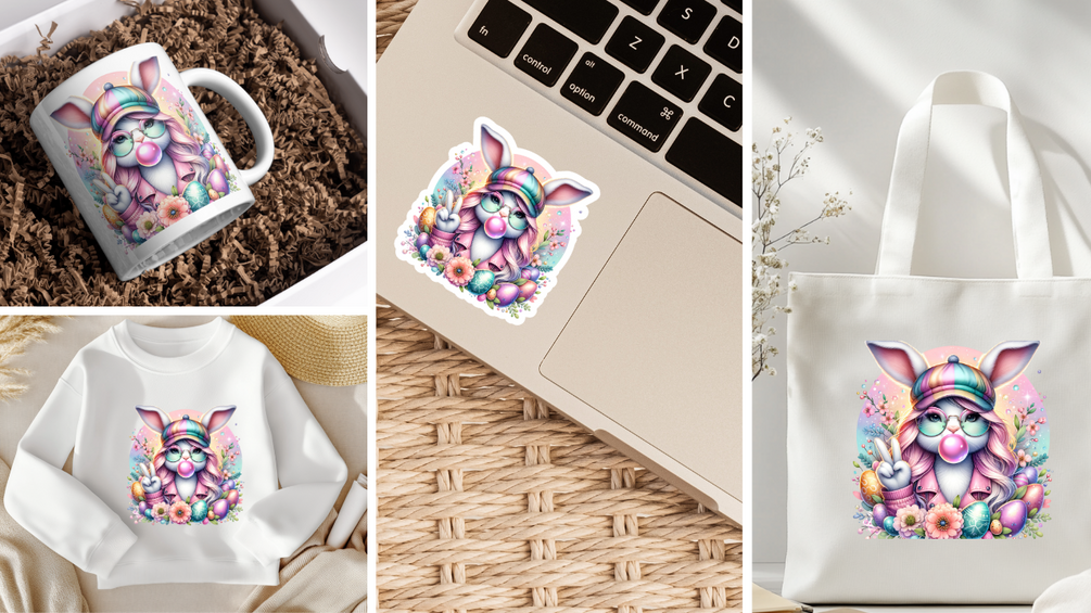 Hop into spring style with this Cool Easter Bunny PNG Clipart! This trendy pastel bunny girl is rocking a rainbow cap, bubblegum pop, and surrounded by decorated eggs and blooming florals — perfect for Easter party invites, planner stickers, digital cards, and cute printable art.