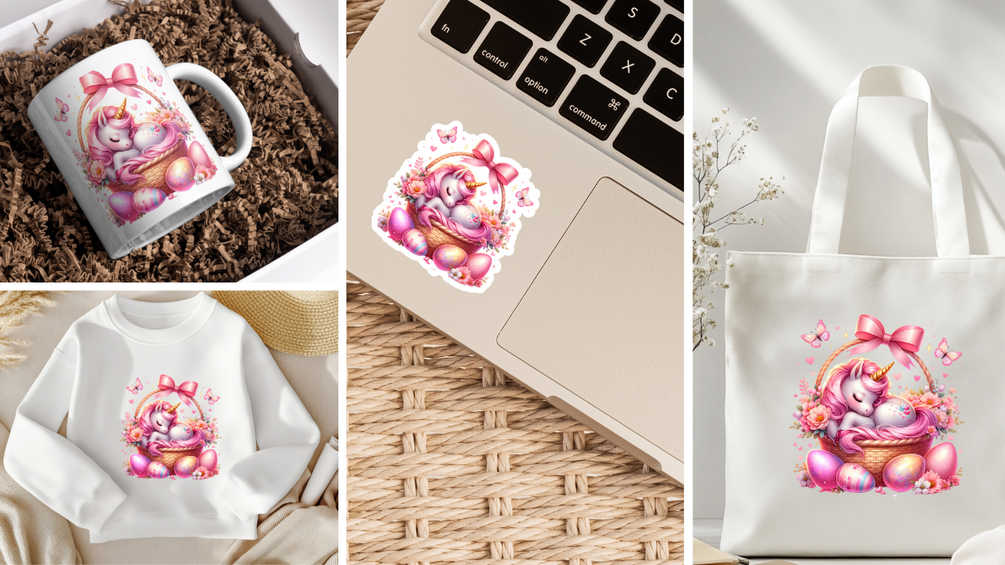 Bring springtime magic to your designs with this Easter unicorn PNG clipart! This kawaii-style baby unicorn features a flower crown, sparkly pink eyes, and pastel eggs—perfect for Easter-themed invitations, cards, wall art, and more.