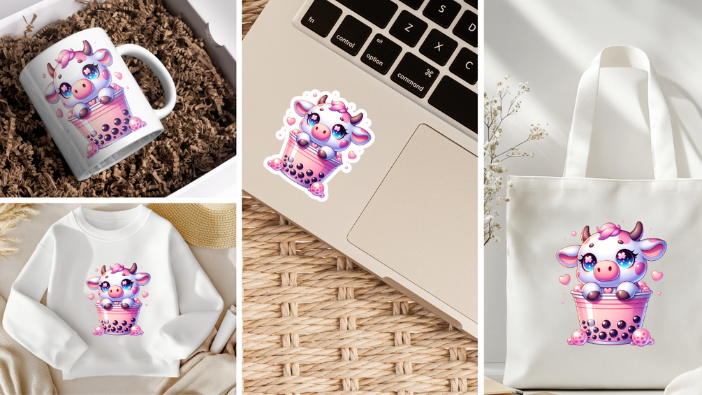 Kawaii pink boba cow png, pink cow sticker, kawaii pink animals, baby cow png, cute cow clipart, sublimation designs, cute animal stickers